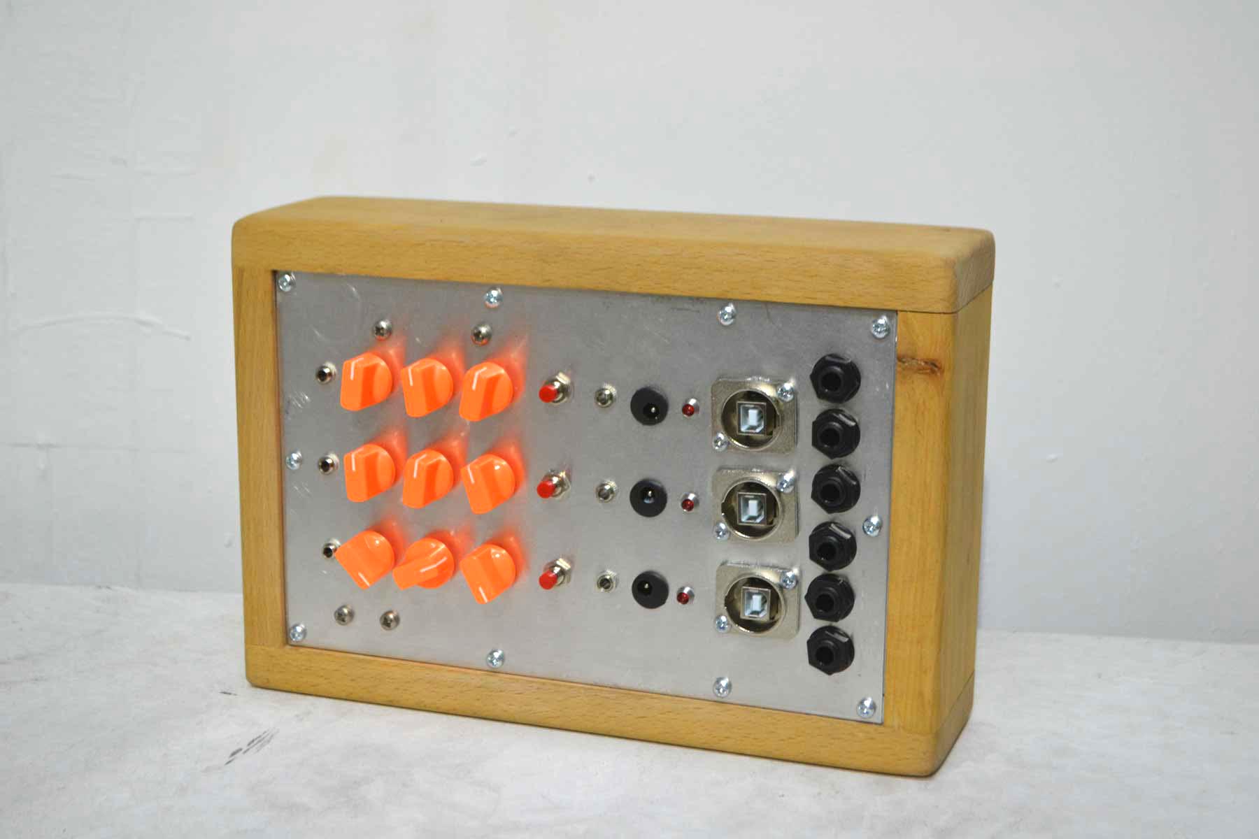 Pour chacune des 3 entrées: contrôle du mouvement sonore avec 3 potentiomètres, 1 push bouton, 1 jack cv in.
